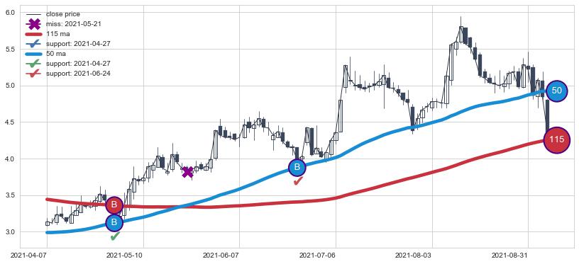 上涨趋势2021-04-07-2021-09-06,均线50, 115确认关键支撑2处