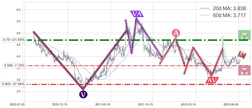 ♘ 阻力价格位4.70,可信任强度96.52%,距离最后交易2022-08-12形成的收盘价格3.870相差 +21.55%