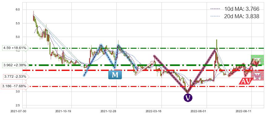 ♘ 阻力价格位3.962,可信任强度86.10%,距离最后交易2022-08-12形成的收盘价格3.870相差 +2.38%