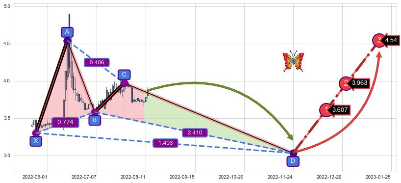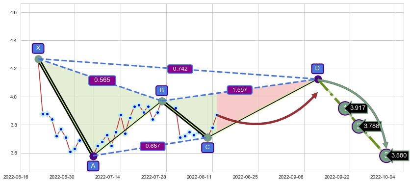 ➣ 未完成【蝴蝶】形态起点X: 2022-05-24, 已到达C点: 2022-07-27, 预测最终D点: 2022-11-24, 共130交易日