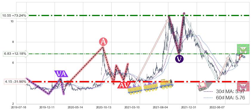 ♘ 阻力价格位6.83,可信任强度52.22%,距离最后交易2022-08-12形成的收盘价格6.09相差 +12.18%