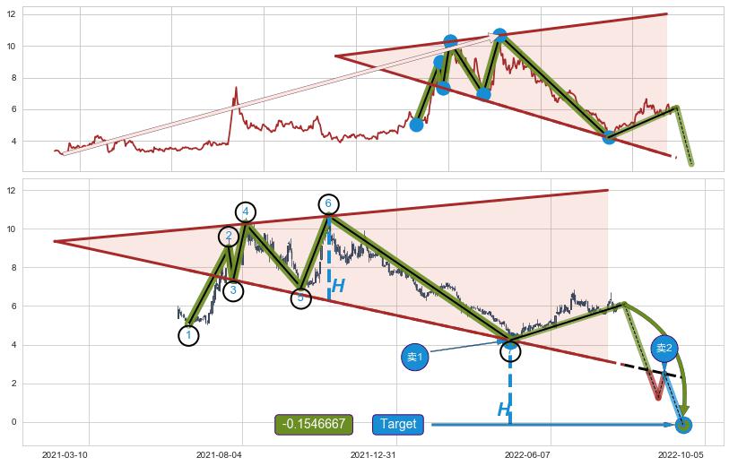 ➣ 【未确认突破,预测即将形成突破】【扩散】三角形反转起点:2021-06-16, 预测突破点:2022-04-26,形态共210交易日