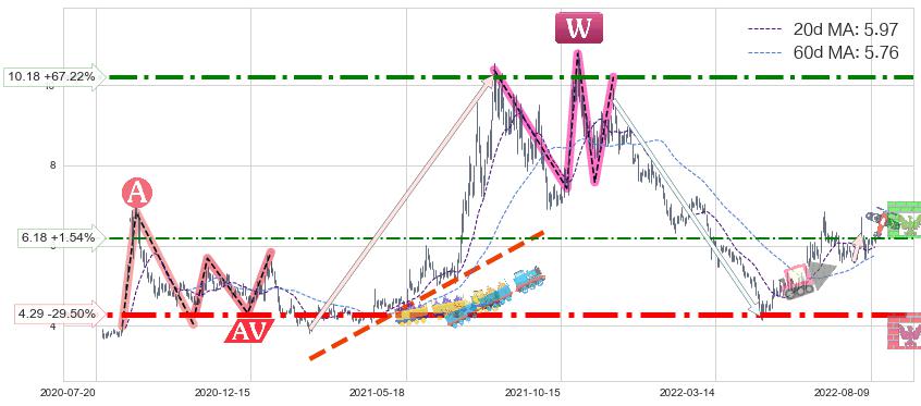 ♘ 阻力价格位6.18,可信任强度49.67%,距离最后交易2022-08-12形成的收盘价格6.09相差 +1.54%