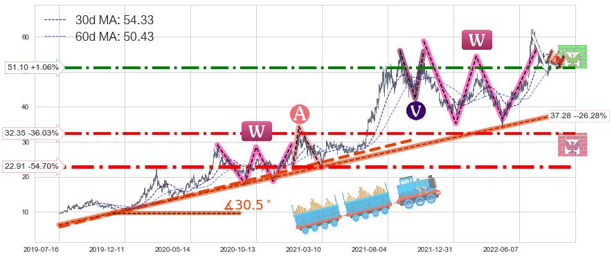 ♞ 30日均线:54.33,60日均线:50.43→ 快线>慢线
