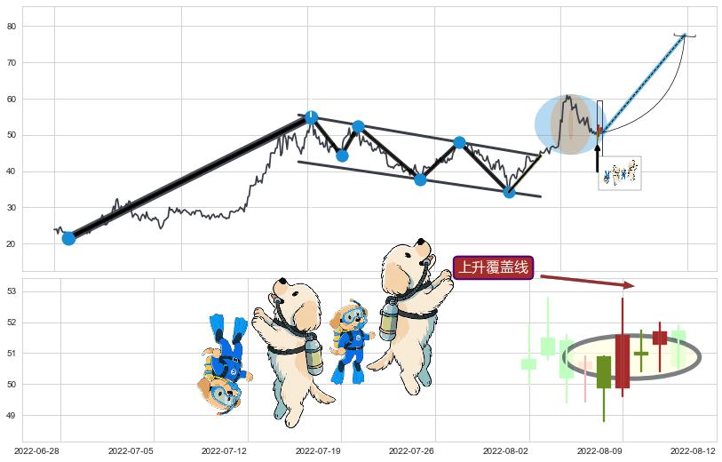 | 2 🅚:高位并排阳线 ➕ 📐:降旗形向上突破击穿阻力位, 猜想持续拉升上涨,被突破的阻力位已变为支撑位 ☞ 看多信号 ⇥ 【🅚线】交织【图形】⇥ 综合量化分数: 55 | > |