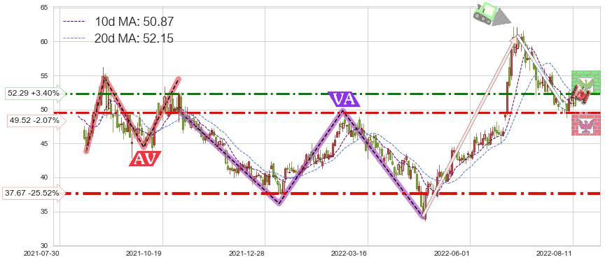 ♘ 阻力价格位52.29,可信任强度59.18%,距离最后交易2022-08-12形成的收盘价格50.57相差 +3.40%