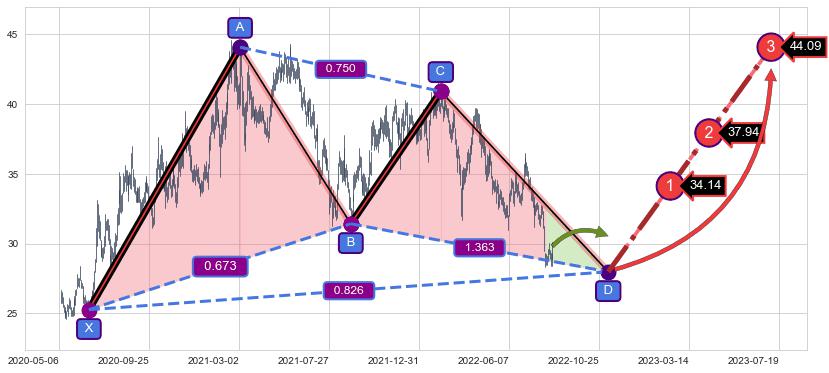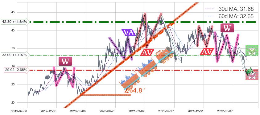 ➣ D点拟合预测价格27.99,距离最后交易收盘价格29.82相差 -6.14%