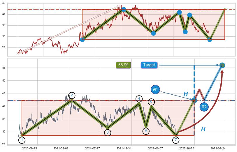 ➣ AI预测: 假定反转启动后, 第❶目标位置(2023-02-13, 34.14)