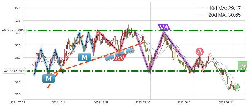 ➣ 【仅预测突破】最后价格:29.82与预测突破价格:28.11→【空间较大】后续最小【反转】第一目标价格→(2022-10-13: 21.64 )