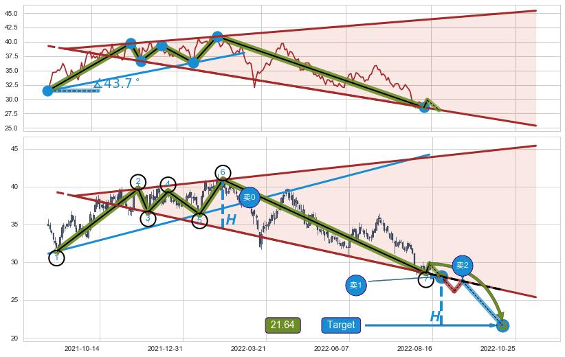 ➢ 最小反转跌幅→𝐇: 6.47 (逐步抬高阻力斜边最后的阻力点⑥与支撑边垂直距离)