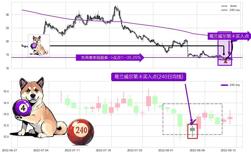 形态多维评估: ⚀ 2022-08-04-日显现 葛兰威尔均线 240日均线 第④买入点 下降趋势均值回复的短线反弹信号,后市看涨,买进信号