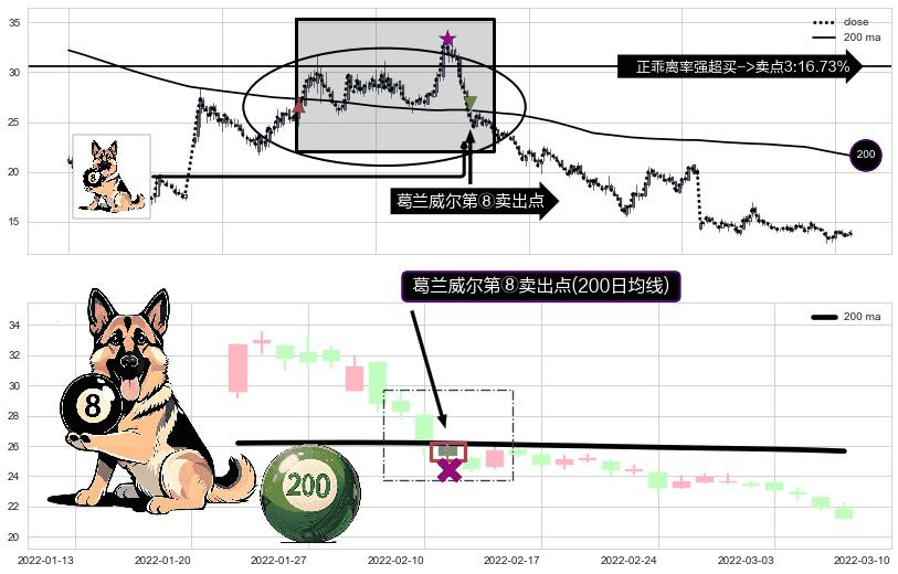 形态多维评估: ⚀ 2022-02-11-日显现 葛兰威尔均线 200日均线 第⑧卖出点 下降趋势的中继信号,后市看跌,卖出信号