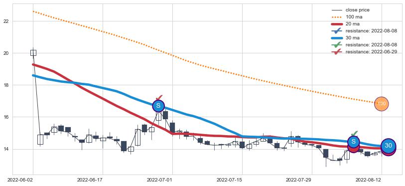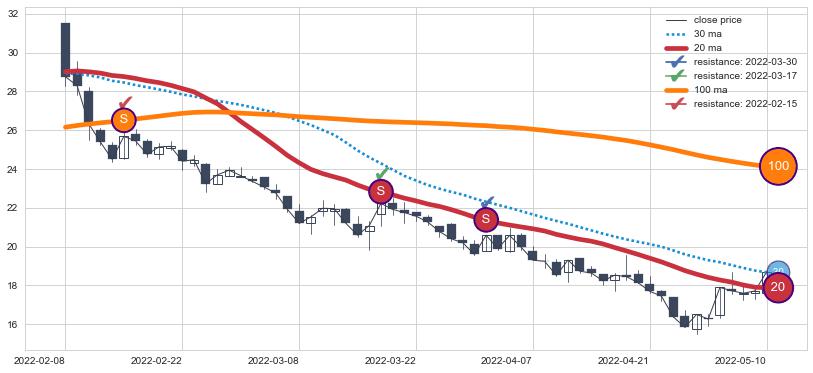 下跌趋势2022-02-08-2022-05-10,均线100, 20确认关键阻力3处