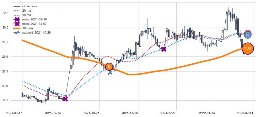 上涨趋势2021-08-17-2022-02-11,均线100确认关键支撑1处