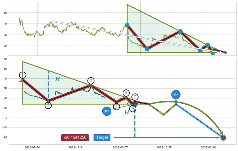 ➣ 最小中继整理跌幅→𝐇: 13.92 (上平行阻力线与下平行支撑线的垂直距离)
