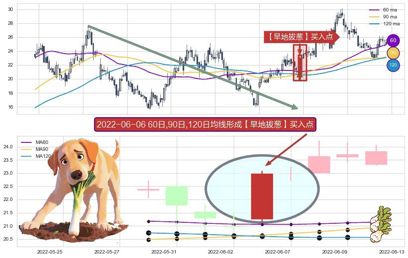 ⚀ 2022-06-06日显现 60日-90日-120日均线 【旱地拔葱】买入点 看多信号,后市看涨,买入