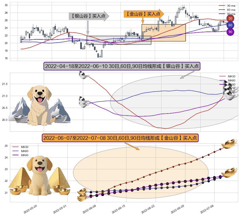 ⚃ 2022-06-08-日至2022-07-08-日显现 30日-60日-90日均线 【金山谷】买入点 其再次确认了买入信号,可靠性更强,买入