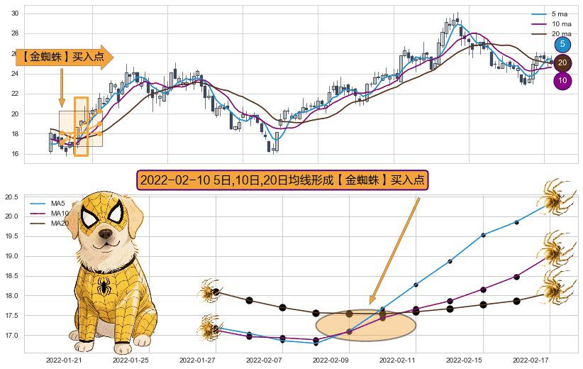 ⚀ 2022-02-10日显现 5日-10日-20日均线 【金蜘蛛】买入点 看多信号,后市看涨,买入