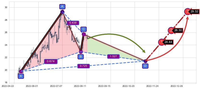 ➢ 距离预测D点位置有足够的下跌空间, 与看涨【伽利】形态相反,实际方向【看跌】