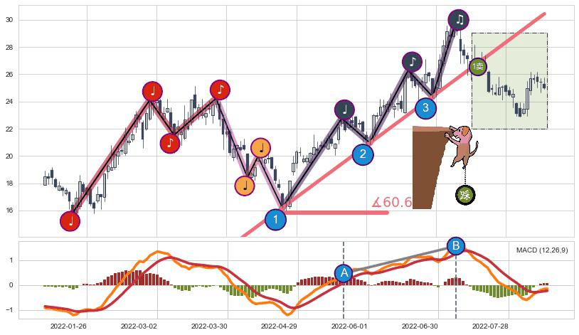 从2022-04-25至2022-07-22,共包含61个交易日,阶段股价上涨46.59%,阶段股价变动位移路程比: 1 : 3,上涨趋势角度: 45.2
