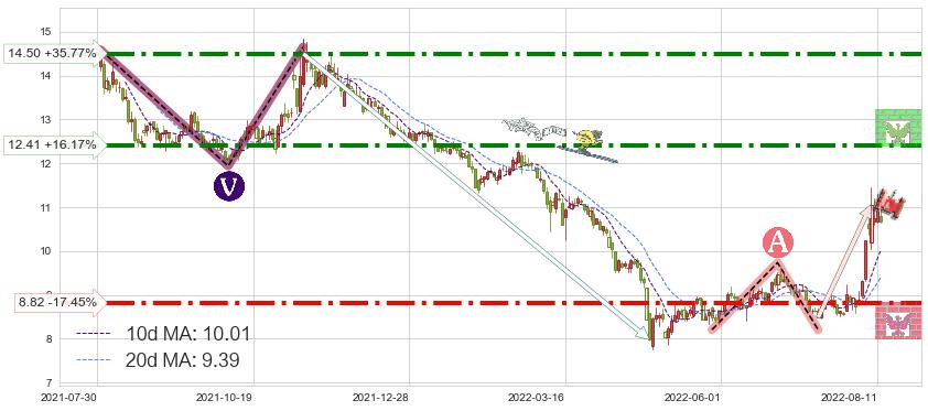 ♘ 阻力价格位12.41,可信任强度76.84%,距离最后交易2022-08-12形成的收盘价格10.68相差 +16.17%