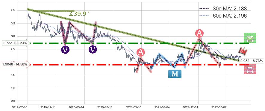 ♘ 支撑价格位1.9048,可信任强度95.46%,距离最后交易2022-08-12形成的收盘价格2.230相差 -14.58%