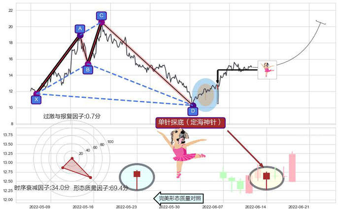 ➢ 🕰 价格走势在2022-06-14至2022-06-14期间形成单针探底(定海神针),残存影响值:1.65