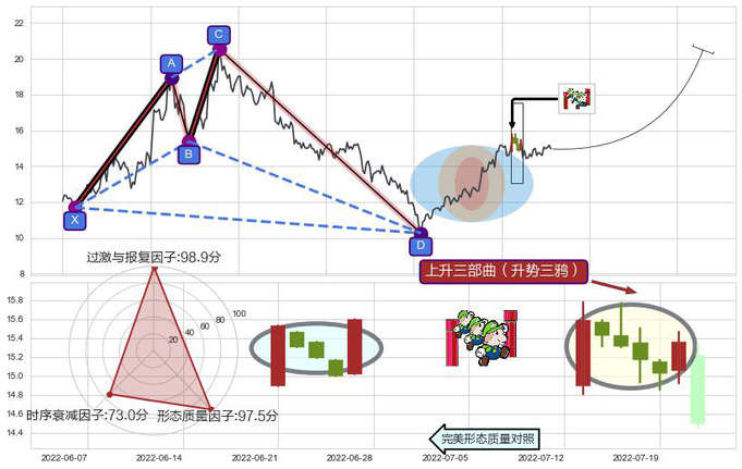 ➢ 🕰 价格走势在2022-07-13至2022-07-20期间形成上升三部曲(升势三鸦),残存影响值:4.50