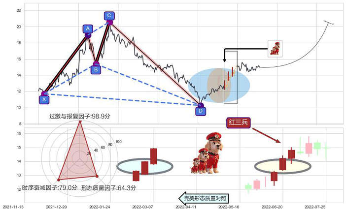 ➢ 红三兵 🔜 谐波鲨鱼d拐点上涨支撑 综合量化分数:58.36 【偏多】
