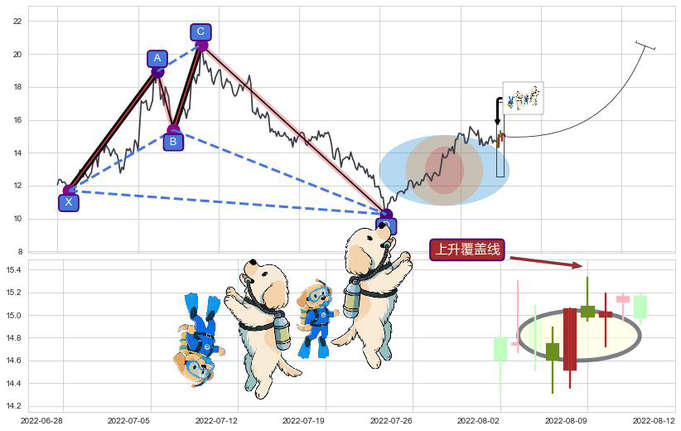 ➢ 🕰 价格走势在2022-08-05至2022-08-10期间形成上升覆盖线,残存影响值:9.66