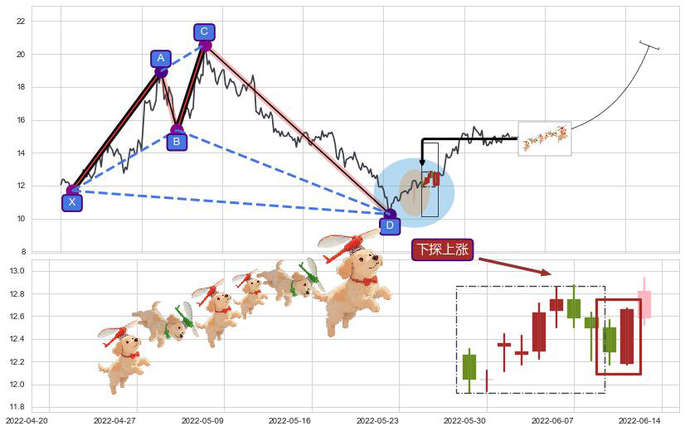 ➢ 谐波鲨鱼:c下跌到达d:猜想拉升 → 上涨 →【拐点】强支撑临近 → 大趋势均值回复