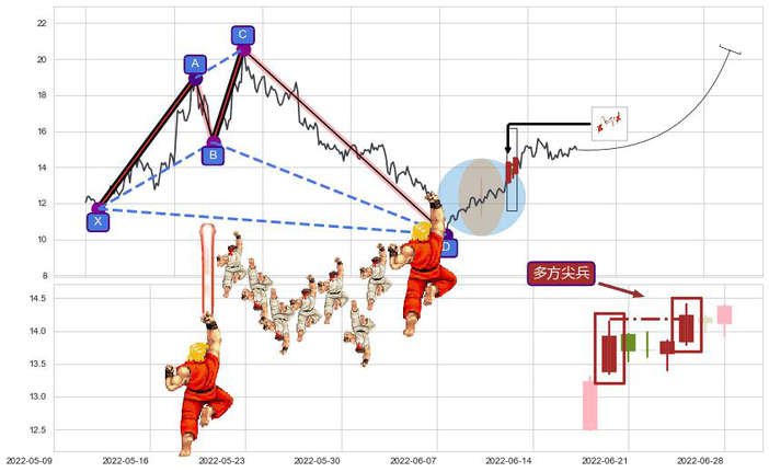 ➢ 🕰 价格走势在2022-06-20至2022-06-24期间形成多方尖兵,残存影响值:4.59