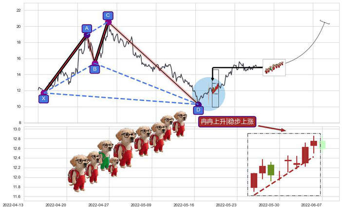➢ 冉冉上升|稳步上涨 + 谐波鲨鱼d拐点上涨支撑信号叠加后【反向回撤率】极低,【看多】信号叠加【存续影响极大】