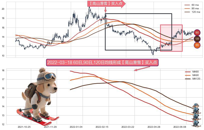⚀ 2021-12-16日-2022-06-17日显现 60日-90日-120日均线 【高山滑雪】买入点 看多信号,后市看涨,买入