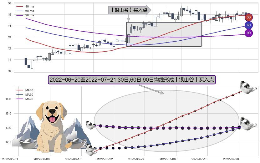 ⚀ 2022-06-21-日至2022-07-21-日显现 30日-60日-90日均线 【银山谷】买入点 看多信号,后市看涨,买入