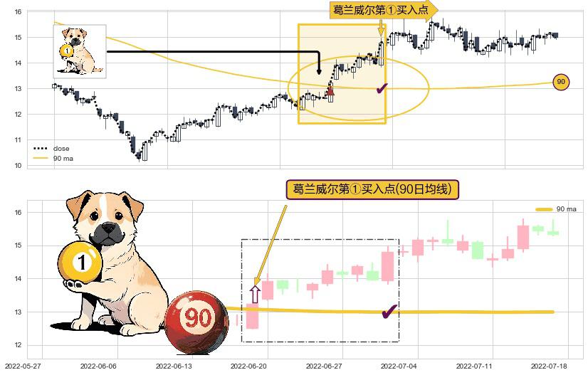 ⚀ 2022-06-17-日显现 葛兰威尔均线 90日均线 第买①入点 走势反转见底信号,后市看涨,买进信号