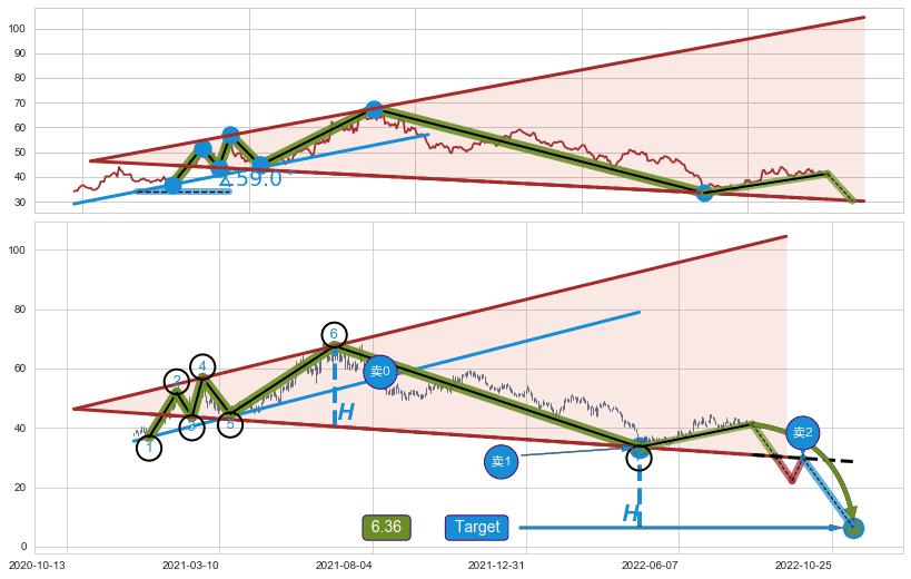 ➢ 最小反转跌幅→𝐇: 27.14 (逐步抬高阻力斜边最后的阻力点⑥与支撑边垂直距离)