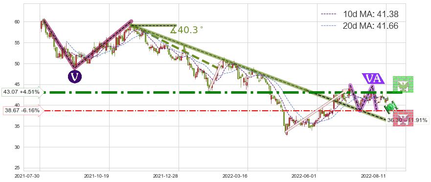 ♘ 支撑价格位38.67,可信任强度52.40%,距离最后交易2022-08-12形成的收盘价格41.21相差 -6.16%
