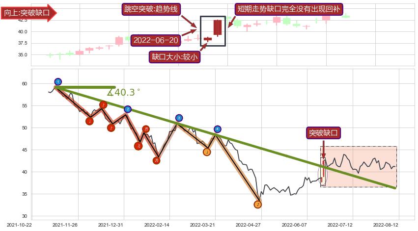 ➣ 2021-11-10-2022-05-20下跌趋势存在反转上涨[机会],其原下跌趋势的阻力位(36.30)已被突破[强支撑信号],原下跌趋势角度: 40.3˚