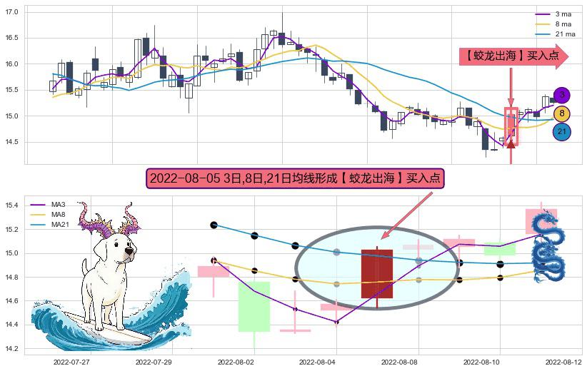 ⚀ 2022-08-05日显现 3日-8日-21日均线 【蛟龙出海】买入点 看多信号,后市看涨,买入
