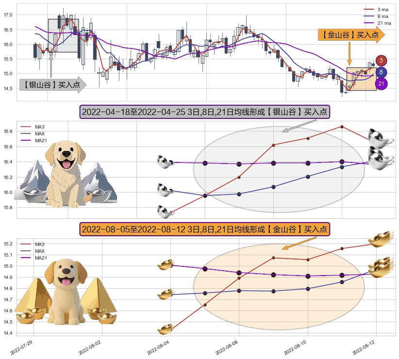 ⚀ 2022-08-08-日至2022-08-12-日显现 3日-8日-21日均线 【金山谷】买入点 其再次确认了买入信号,可靠性更强,买入