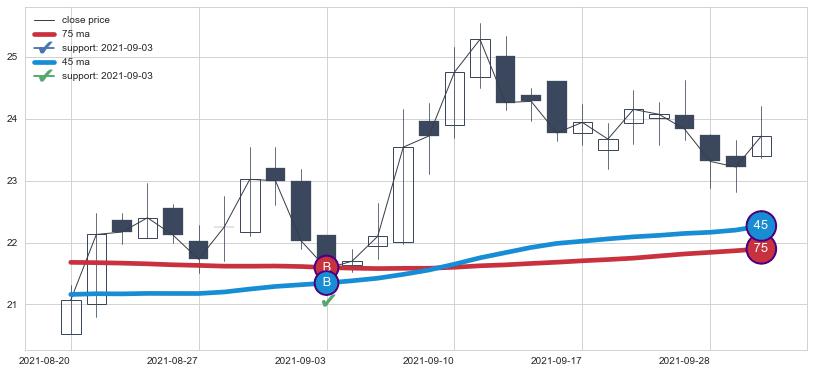 ⚀ 中期均线MA8上穿长期均线MA21形成的交叉是标准 黄金交叉