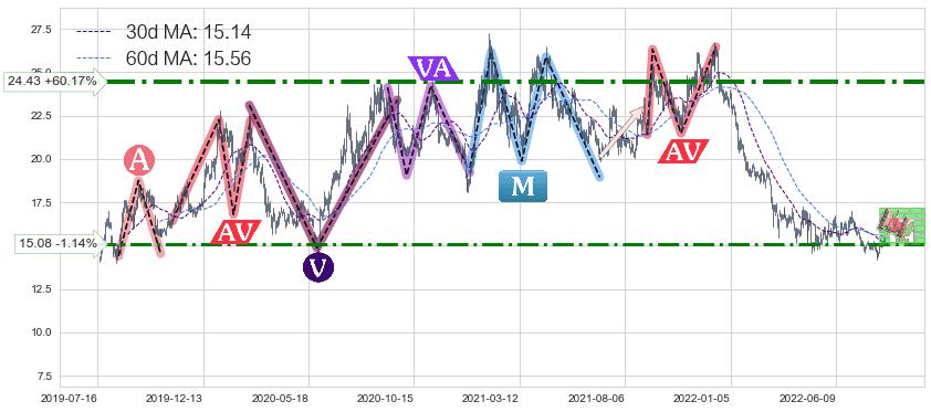 ♘ 阻力价格位15.08,可信任强度66.24%,距离最后交易2022-08-12形成的收盘价格15.25相差 -1.14%
