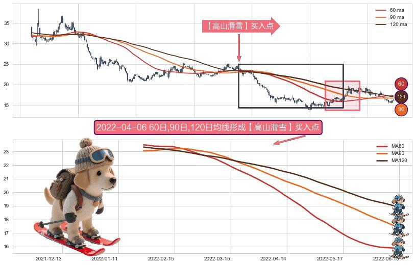 ⚀ 2022-01-24日-2022-06-13日显现 60日-90日-120日均线 【高山滑雪】买入点 看多信号,后市看涨,买入