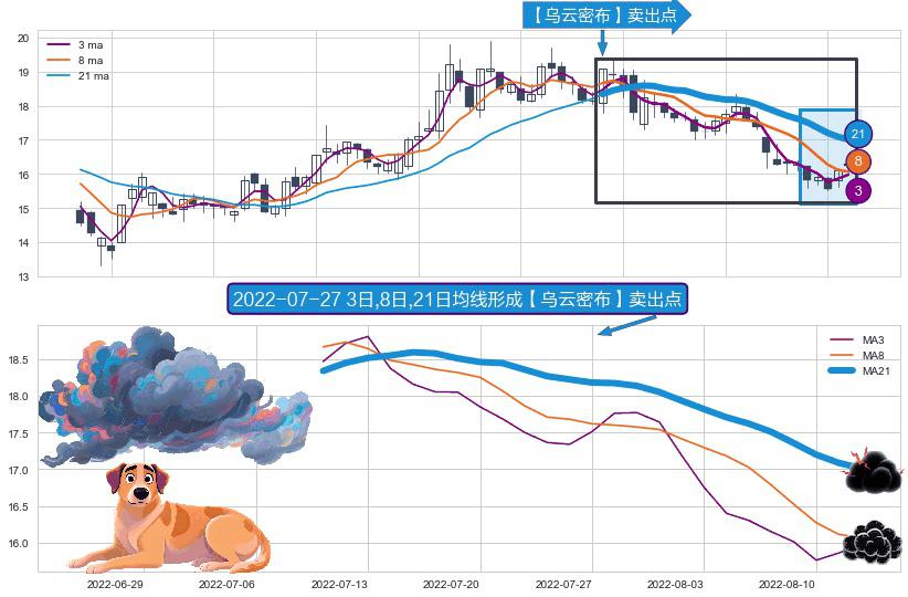 ⚀ 2022-07-11日-2022-08-12日显现 3日-8日-21日均线 【乌云密布】卖出点 看空信号,后市看跌,卖出