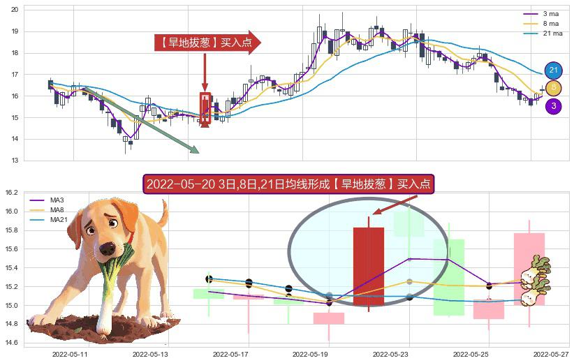 ⚀ 2022-05-20日显现 3日-8日-21日均线 【旱地拔葱】买入点 看多信号,后市看涨,买入