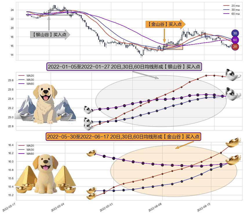 ⚀ 2022-05-31-日至2022-06-17-日显现 20日-30日-60日均线 【金山谷】买入点 其再次确认了买入信号,可靠性更强,买入
