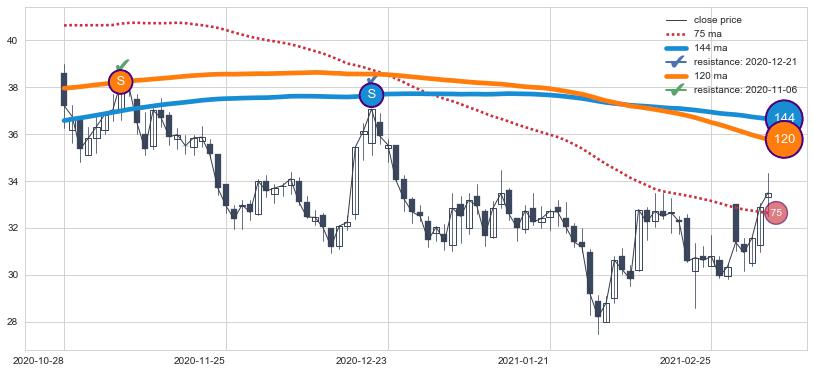 ⚅ 卖点向下突破均线后,价格走势有持续向下的迹象,但动能稍显不足,迟迟不能远离均线