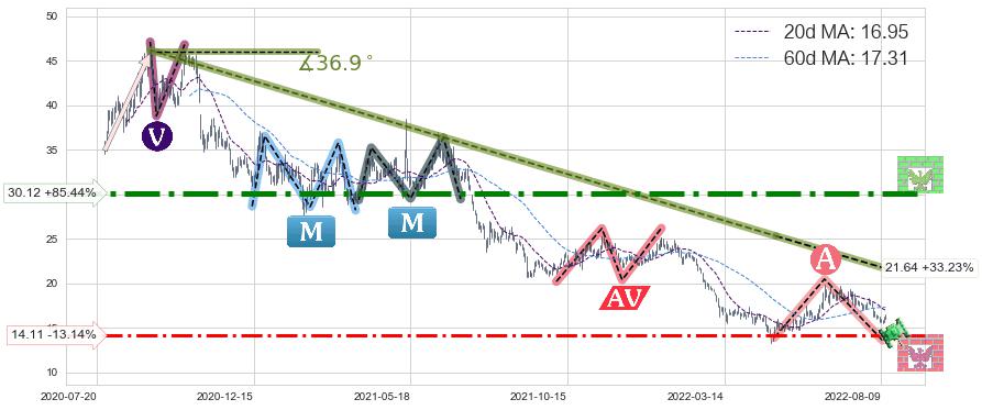 ♘ 支撑价格位14.11,可信任强度55.42%,距离最后交易2022-08-12形成的收盘价格16.24相差 -13.14%
