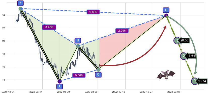 ➣ 未完成【蝙蝠】形态起点X: 2022-01-10, 已到达C点: 2022-08-10, 预测最终D点: 2023-01-30, 共265交易日